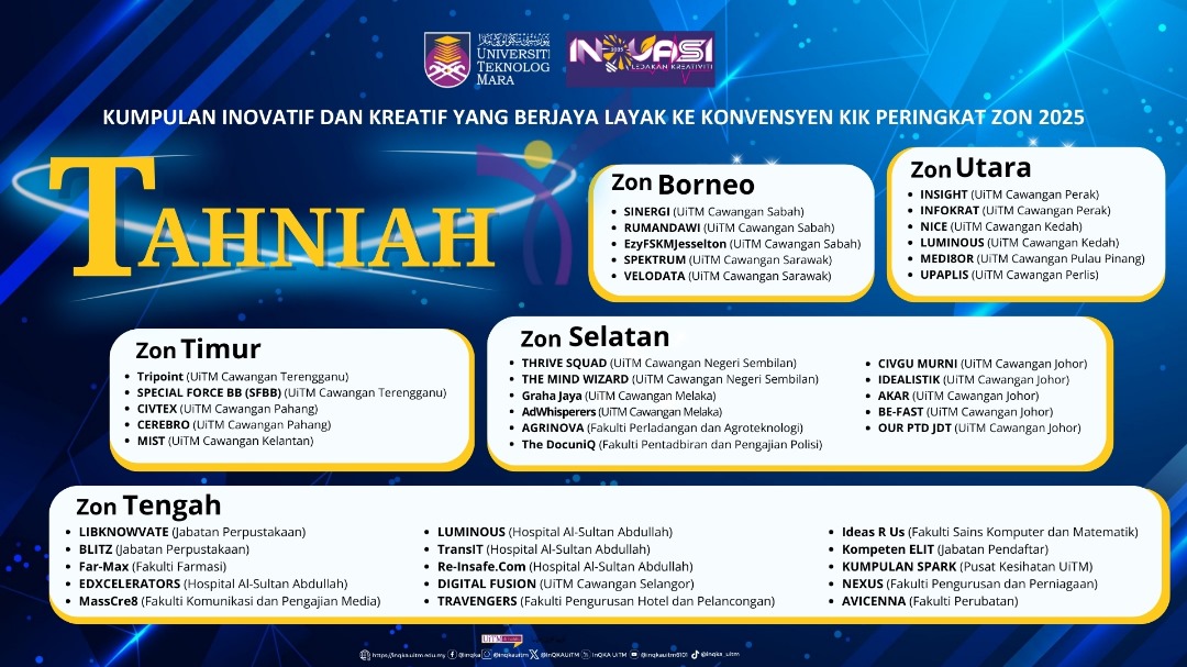 Pihak pengurusan PTAR mengucapkan tahniah kepada dua kumpulan dari Jabatan Perpustakaan UiTM, iaitu LIBKNOWATE dan BLITZ, yang telah berjaya melayakkan diri ke Konvensyen Kumpulan Inovatif dan Kreatif (KIK) Peringkat Zon Tengah 2025!
